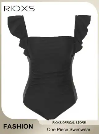 noon.comWomen's Swimwear, Classic One-Piece Swimsuit, Tummy Control Ruffle Bathing Suit, Push Up Padded Swimwear, Ladies Swimsuit With Back Adjustable Strap, Square Neck Ruffle Sleeve Bathing Suit, Ladies Swimwear For Beach Hawaii Pool-Black Slimming Swimwear