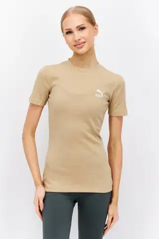Women Sportswear Fit Ribbed Short Sleeve Outdoor T-Shirts, Sand Dune