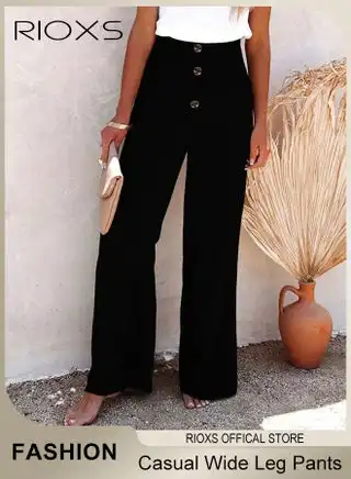 Women Wide Leg Ruffle Pants Casual Loose High Waist Tie-Knot Trousers With Pockets Woman's Button-up Pants
