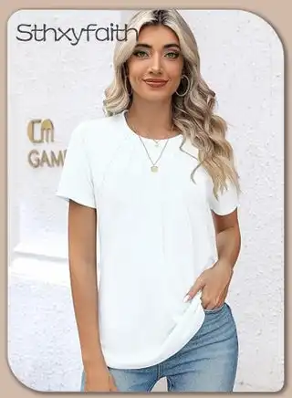 Womens Fashion Round Neck Tops Short Sleeve Pleated shirts for womens Summer Dressy Casual Blouses for women dressy casual Shirt
