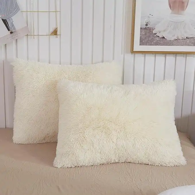 XeGe Faux Fur Pillow Cases, Ultra Soft Fluffy Bed Pillowcases, Long Plush Shaggy Decorative Pillow Covers, Furry Fuzzy Fleece Pillow Protectors Zipper Closure, 2 Pack(Standard, Light Beige)