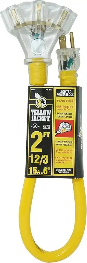 Yellow Jacket 2882 12/3 Heavy Duty 15-Amp, 125 Volts 1875 Watts, Premium SJTW Contractor Grade 3 Outlet Extension Cord with Lighted End, 2-Feet, Yellow, UL Listed, 2 Foot,€¦