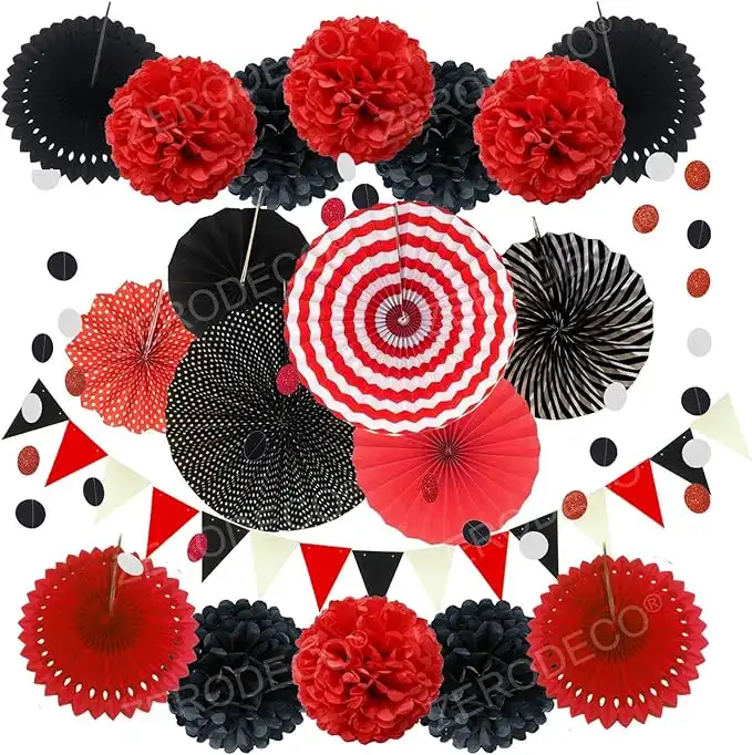 amazon.aeZERODECO Party Decoration, 21 Pcs Black and Red Hanging Paper Fans Pom Poms Flowers, Garlands String Polka Dot and Triangle Bunting Flags for Minnie Mouse Birthday Parties Baby Showers Wedding