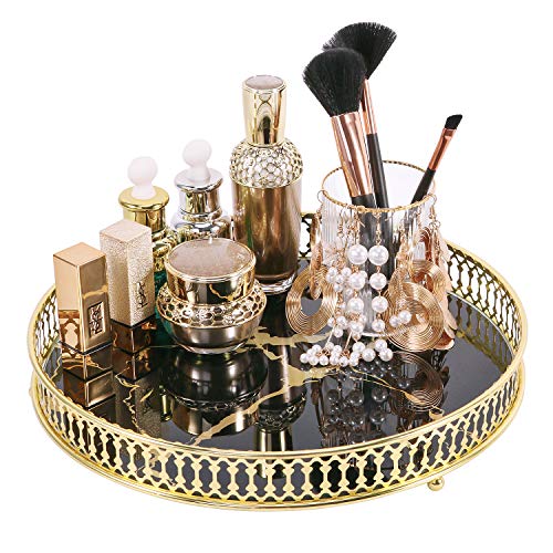 Zosenley Makeup Organizer Tray, Decorative Glass Vanity Tray, Round Cosmetic Storage for Jewelry, Makeup, Perfume, Decor and More, Size 11.4”, Black Marbling