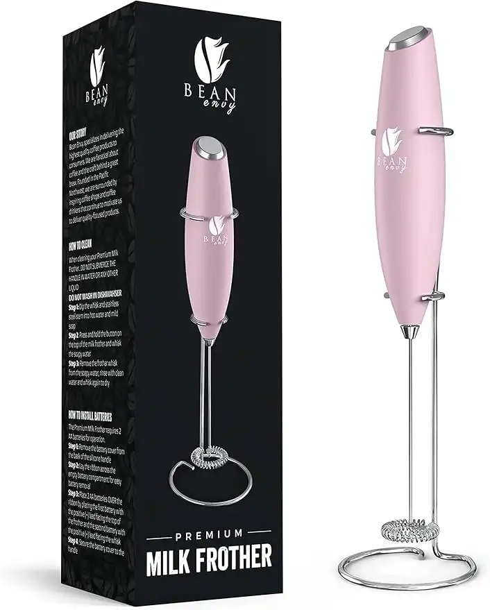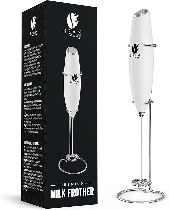(5 products)Bean Envy Milk Frother Handheld - Perfect For The Best Latte - Whip Foamer - Includes Stainless Steel Stand - Black