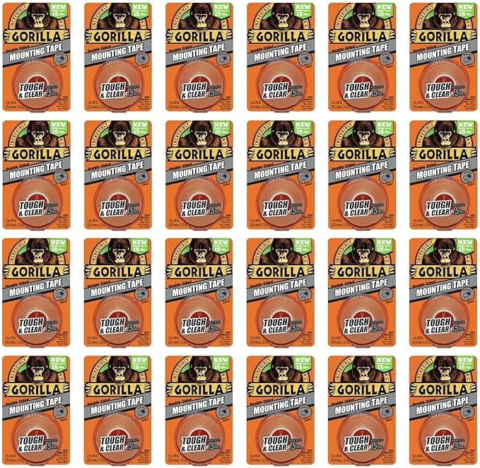 (1 product)Gorilla Mounting Tape, Tough and Clear, Double-Sided, 1" x 60", Clear - 24 Pack
