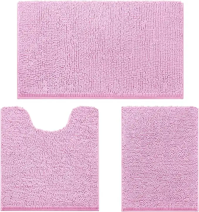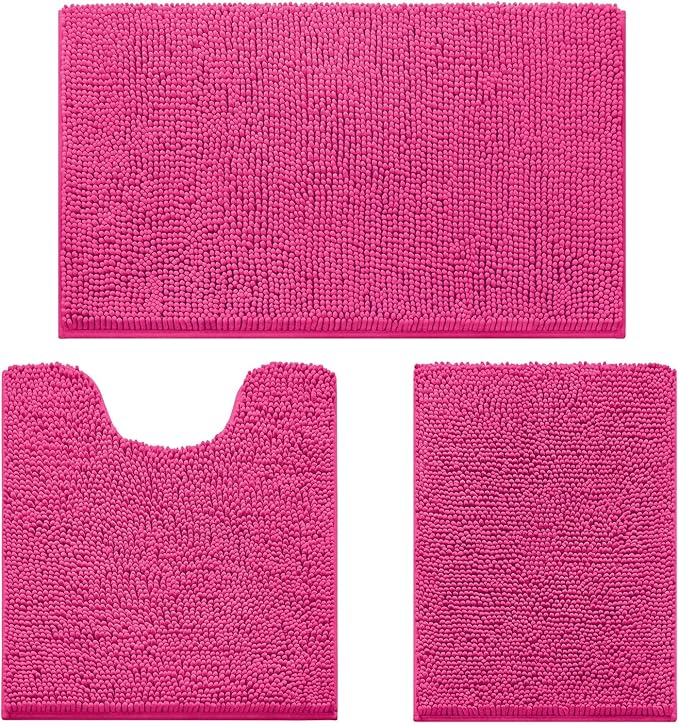 HOMEIDEAS 3 Pieces Bathroom Rugs, Ultra Soft Non Slip Absorbent Chenille Toilet Bath Mat Set (Hot Pink)